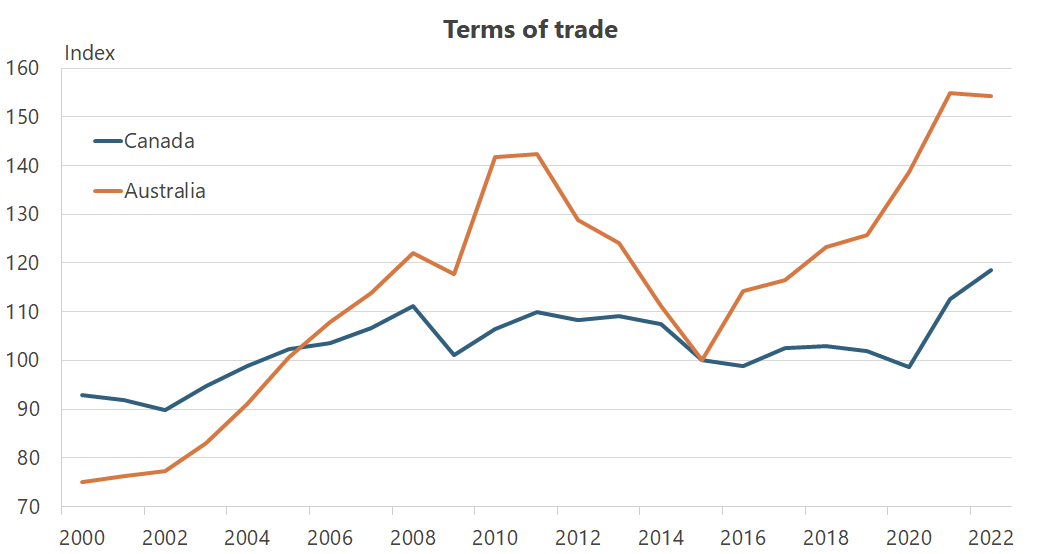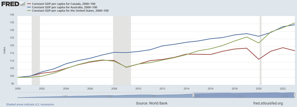 It’s difficult to grow without investment, and Canada’s GDP per capita has underperformed peers like Australia and the US ever since, largely due to a chronic lack of productivity growth but without the good fortune of a new mining boom to rescue them: