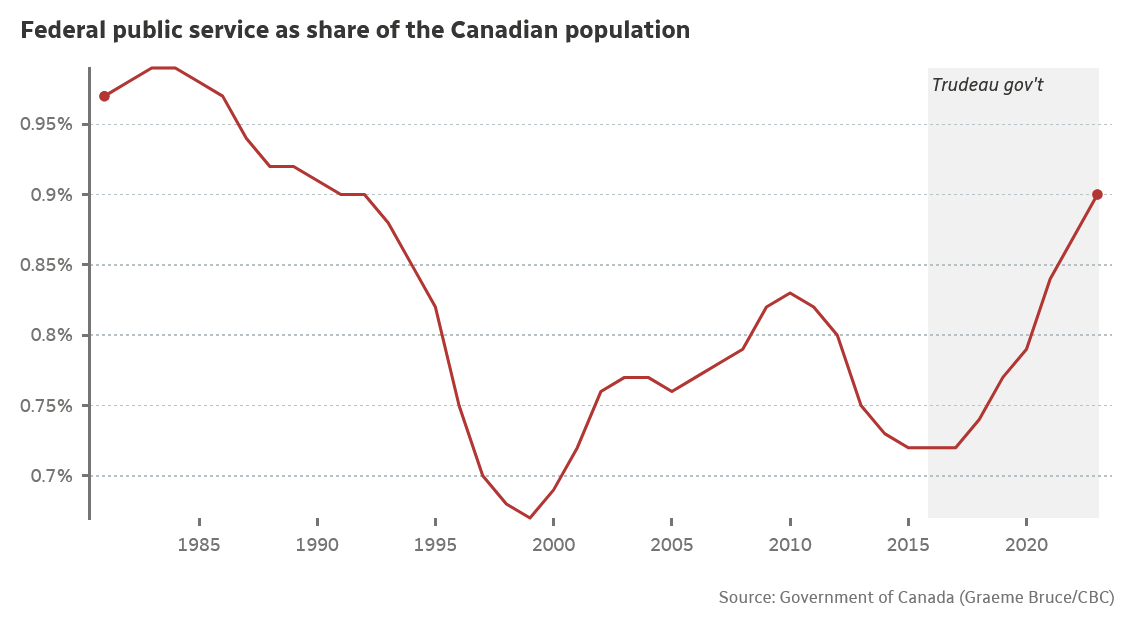Moreover, Trudeau has increased the relative size of the public service, and per capita federal spending is now at an all-time high, financed with debt that is contributing to Canada’s own cost of living, inflationary crisis.