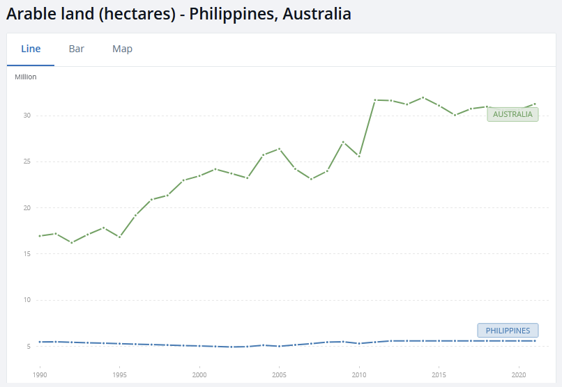 I’m currently in the Philippines, so it’ll make for a decent case study. This is a country with a population of around 118 million, a number that has grown from just 10 million only a century ago, back when Australia had 5.5 million people. Over the ensuing hundred years, Australia grew by around 385% to the Philippines’ 1,080%, despite the Philippines being a relatively small archipelago and a lot less suitable to growing food than Australia. From not quite double Australia’s population a century ago, the Philippines is now home to nearly five times as many people as we do.