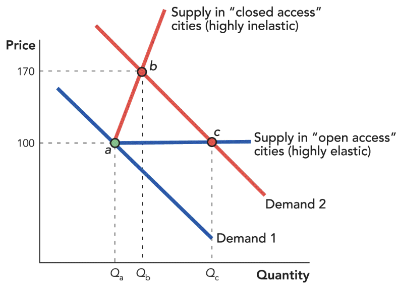 “When demand increases in a closed access city [where it’s difficult to build], the equilibrium moves from point a to point b. Notice that prices increase a lot and the quantity of housing increases only slightly. In comparison when demand increases in an open access city, the equilibrium moves from point a to point c where the quantity of housing increases a lot and prices increase only slightly.”