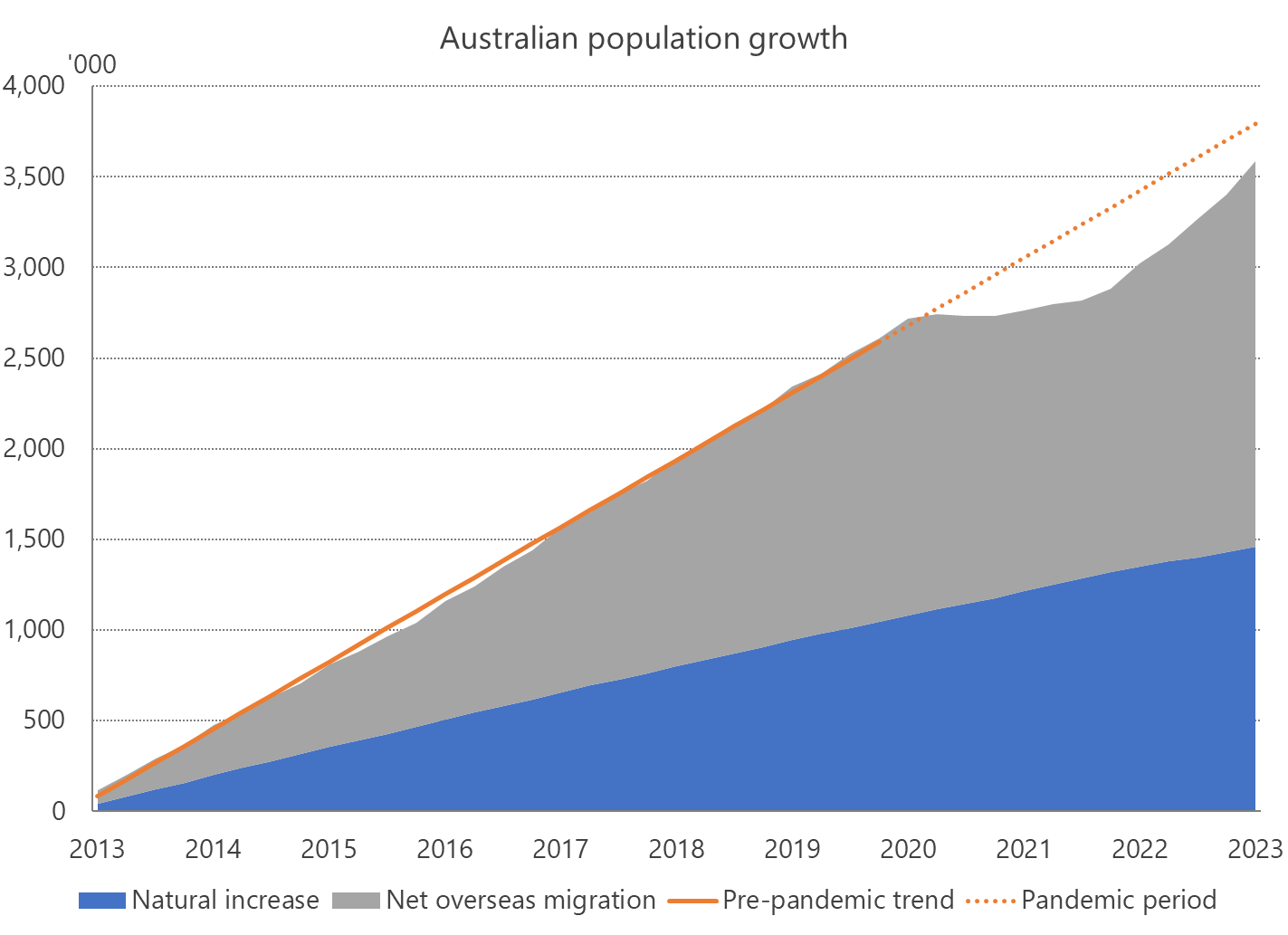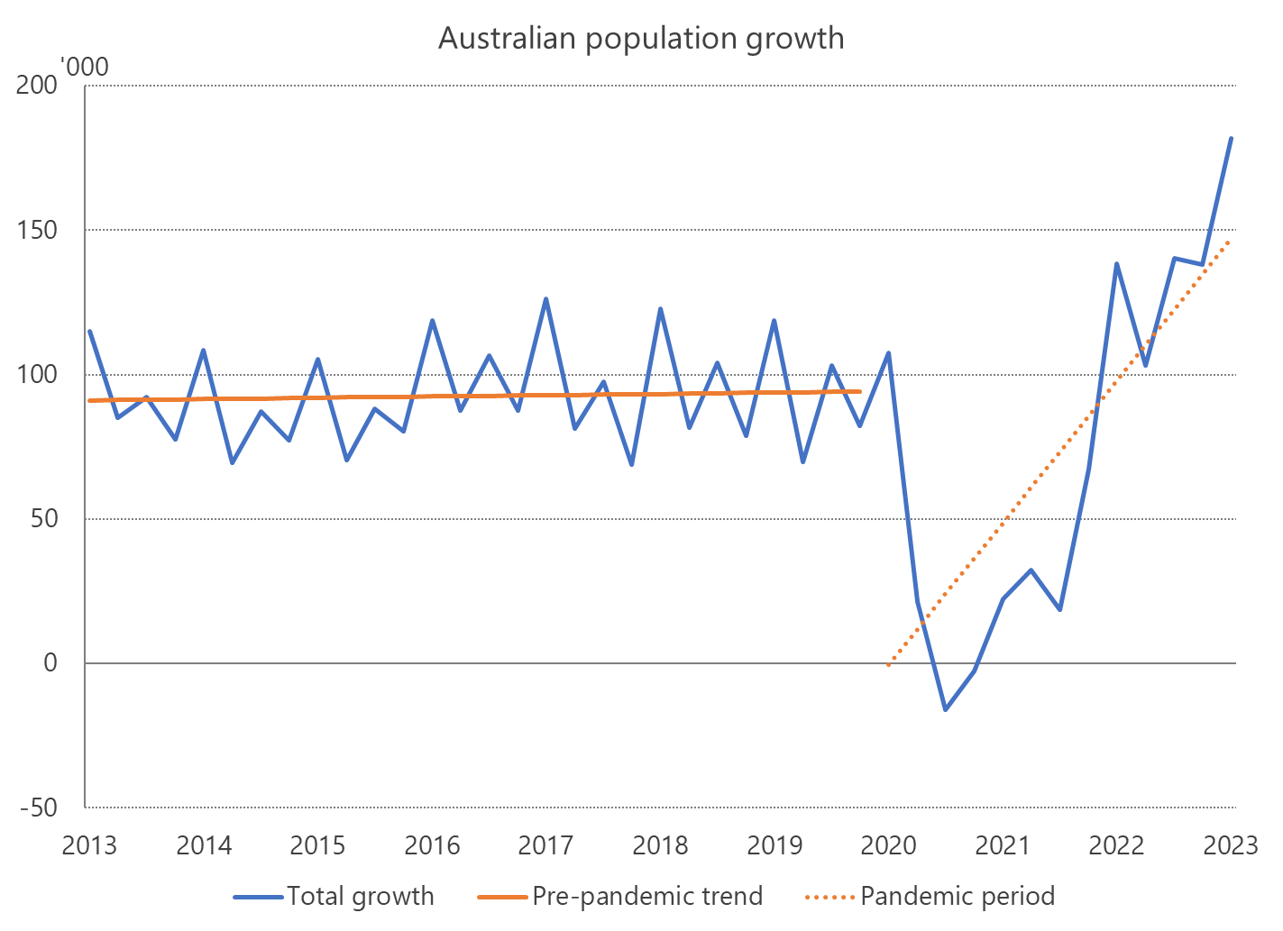 As of March 2023 (the last available data point), we were still around 250,000 people short of where we would have been based on the pre-pandemic migration trend. If the current rate of strong migration continues (around 50,000 people per quarter above the long-run), we’ll be back to trend by the middle of next year.