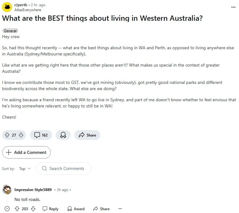 Go to the top comment of just about any social media post discussing the perks of Perth and there’s a good chance it will look something like this: