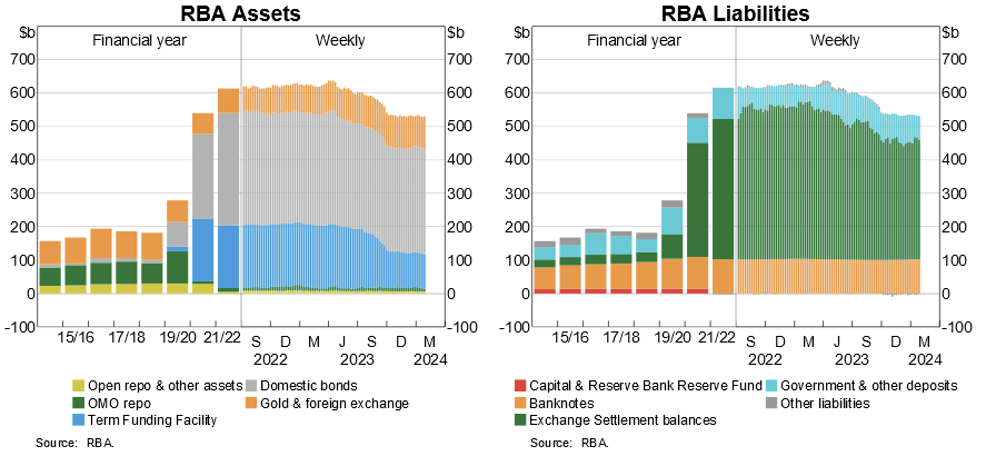 The RBA’s own charts show this effect in action, with the surge in bond purchases on the asset side matched very closely by growing ES balances on the liability side on its balance sheet: