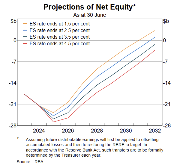 For example, because of its QE losses the RBA will not be able to pay what is normally a multi-billion dollar dividend to the government for perhaps a decade or more, which is how long the bank expects it to take for its balance sheet to return to positive net equity: