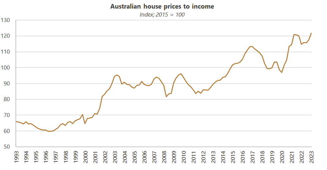 That suggests the public’s concern about house prices – at least compared to other issues, such as the cost of living – may be waning. That’s despite affordability continuing to decline: in Australia, it now costs about twice as much in terms of income to buy a house than it did in the mid-1990s.