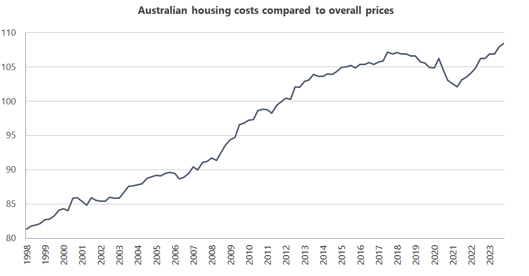 Another way to look at housing affordability is to compare it to the price of everything else people spend their incomes on. Housing costs have been rising faster than other goods and services since the late 1990s, and are now nearly 10% above overall CPI. In other words, houses are now also relatively unaffordable.