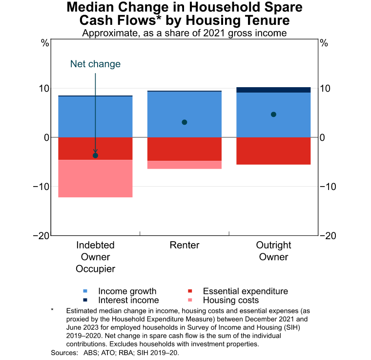 “On average, households with a mortgage have experienced a significant decline in spare cash flows, unlike other households. For these households, higher interest costs have reduced their cash flow by more than the rise in inflation has. By contrast, the spare cash flow of renters has, on average, risen a little as high inflation and rising rents have been more than offset by growth in income. There will, of course, be diverse outcomes for individuals within these groups.”