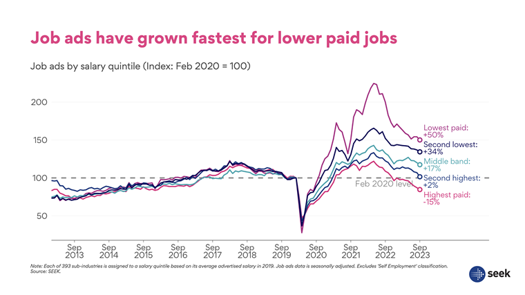 Most of the gains were accrued by workers switching jobs rather than getting a pay rise or promotion. I wondered whether the same would be true in Australia and then Seek was kind enough to put out this chart, which would suggest that it probably is: