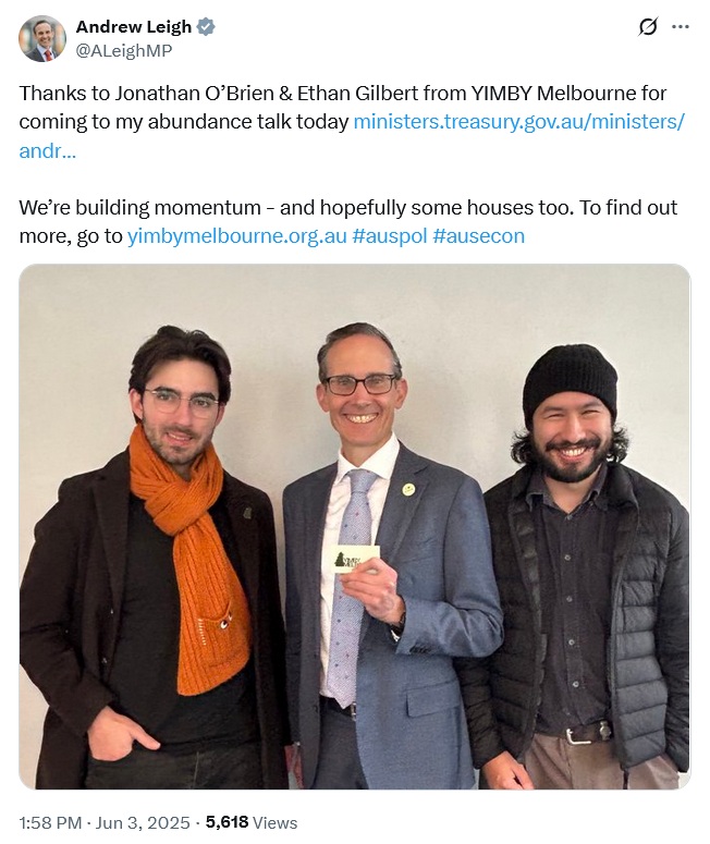 Albo’s comments, plus a recent speech by Andrew Leigh (the new Assistant Minister for Productivity), offer a glimmer of hope that the abundance agenda might have found its way into Australia’s federal Labor party. Leigh even tweeted a photo of himself with the YIMBY (yes in my backyard) Melbourne group, holding up their business card: