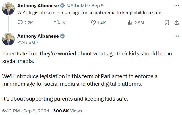 With that out of the way, the issue that got me fired up was the government’s proposed ban on social media for children. The specific age hasn’t been confirmed – the draft legislation is yet to be released – but it doesn’t matter whether it’s 5, 7, 11, 13, 17, or 19: it’s a bad idea that, along with the disinformation laws announced yesterday, will set freedom of expression in Australia back even further than it already is.