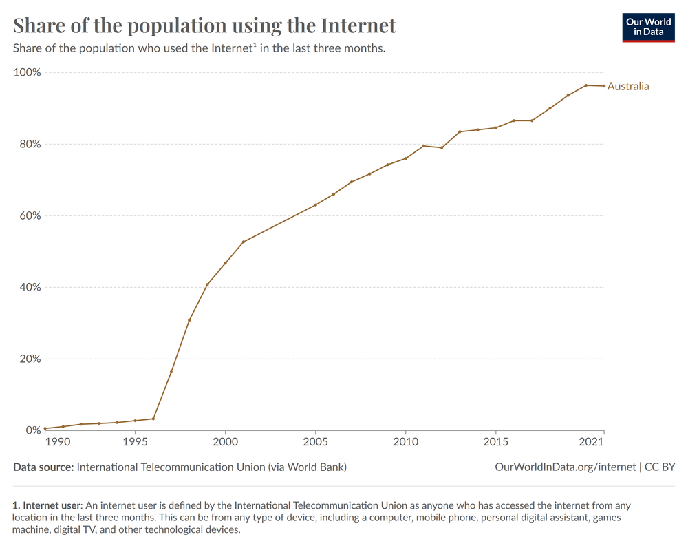 As for the claim that no generation has faced this challenge before, I guess that’s technically the truth but I think Albo’s belittling other, more challenging transitions our ancestors faced. For example, telling your kids to use their smart phones a bit less strikes me as an easier challenge than going from hunter-gatherers to agrarians, or from rural to urban dwellers. Hell, just 30 years ago almost no one in Australia used the internet. Now everyone does: