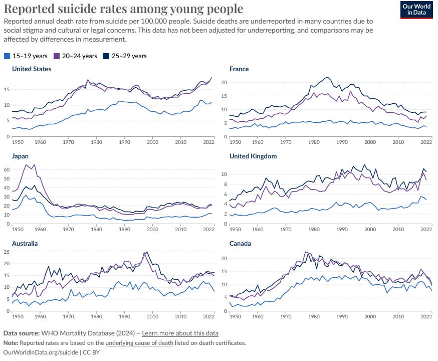 Going back to 1950, there’s no clear ‘social media’ jump in self-harm and the trends vary widely by country, even though social media has taken over everywhere. If anything, we should be most worried about a recession; the late 1990s were a bad time to be young in Australia: