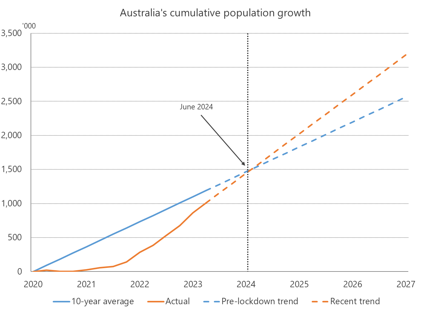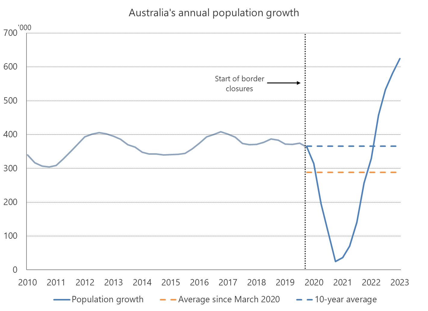 You’ll notice the dashed orange line is still below the dashed blue line – despite the recent surge, average population growth since the borders were slammed shut and then reopened is still below where it would have been had the pandemic never happened, assuming no change to Australia’s migration policy.