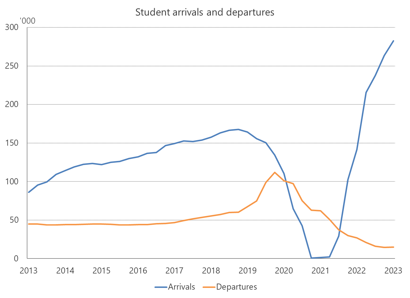 “Many potential migrants didn’t come to Australia in 2020 and 2021 because of border closures and other pandemic impacts. During this time temporary visa holders recorded the largest declines in arrivals. In 2022-23 the number of migrants arriving on temporary visas has gone up but the number departing has reduced slightly.”