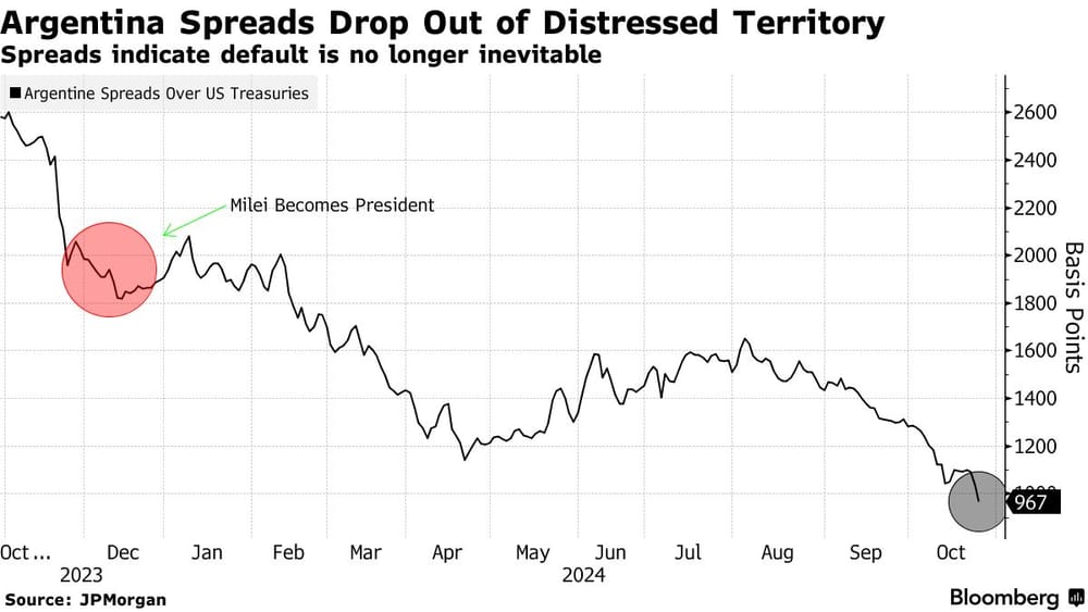 Importantly for Milei’s prospects, real wages are even beginning to recover, and bond markets are no longer pricing Argentina’s debt at “distressed” levels:
