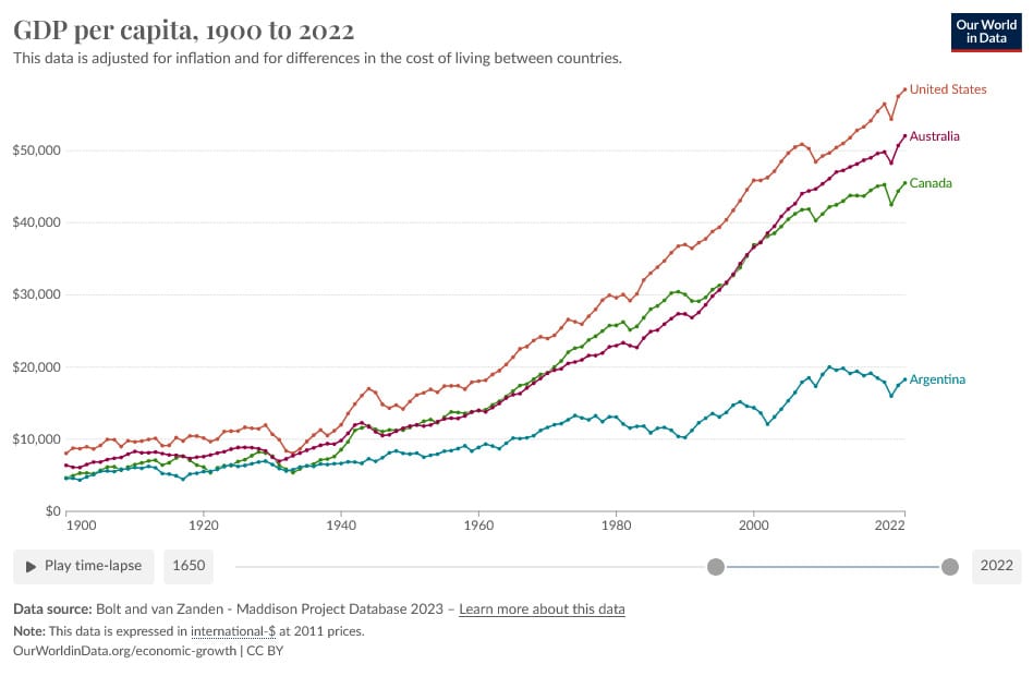 There’s no doubt that the Argentine economy is a mess and in need of something radical. It has been a mess since at least 1930, largely because it “never finished the transition to the open democracy supported by the rule of law”, as happened in Australia, Canada and the US.