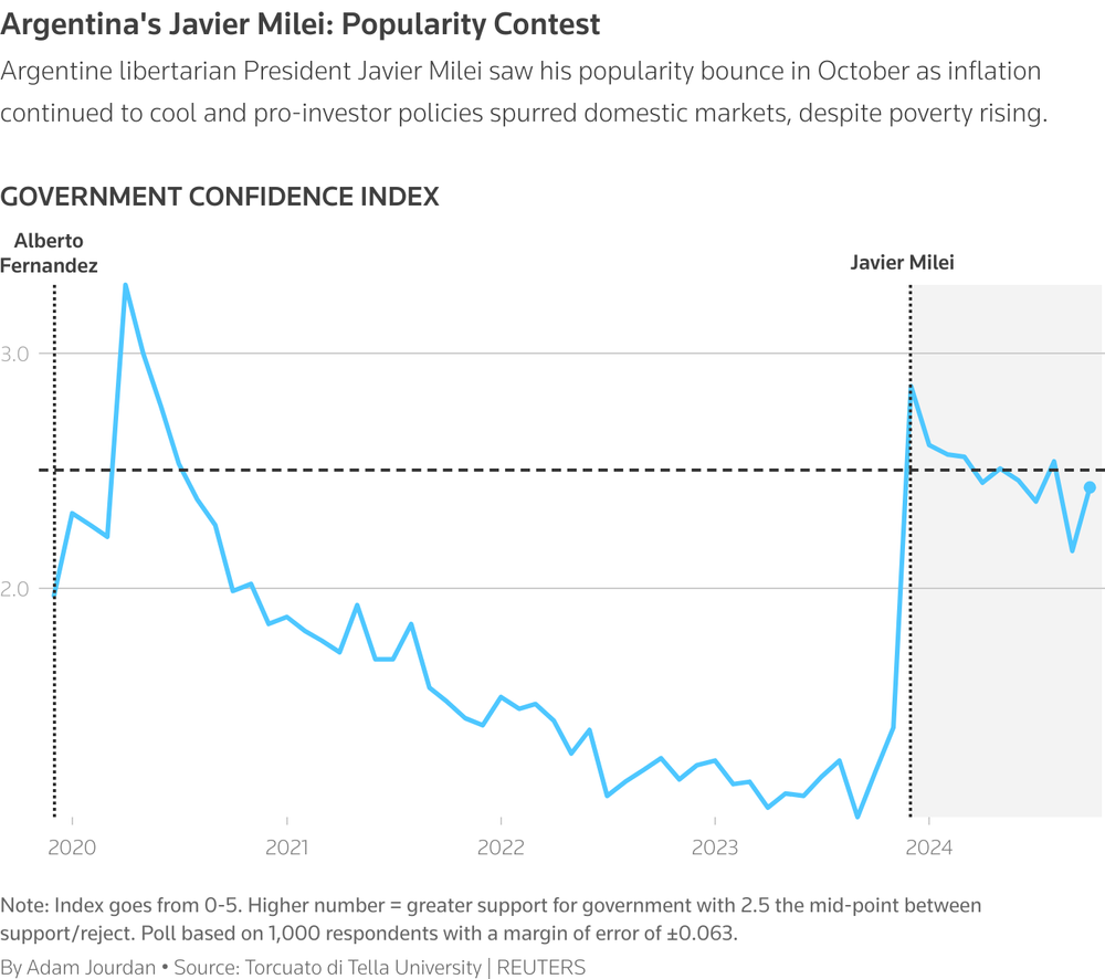 The good news for Milei is that the country’s poverty rate has finally begun to decline. And after plunging in September, his popularity rose again in October: