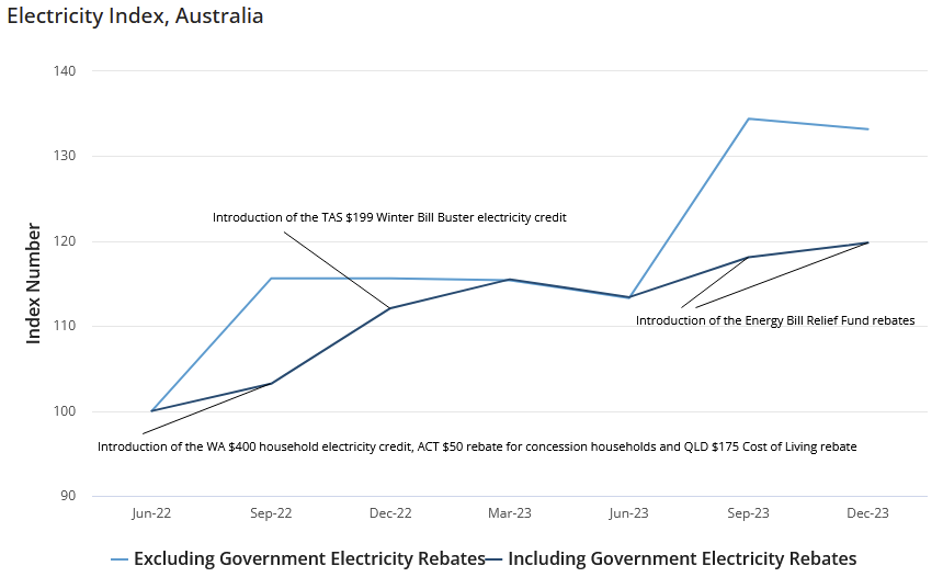 “The introduction of the Energy Bill Relief Fund rebates from July 2023 has moderated the increase in electricity bills for households. Electricity prices have risen 5.7 per cent since the June 2023 quarter. Excluding the Energy Bill Relief rebates, electricity prices would have increased 17.6 per cent over this period.