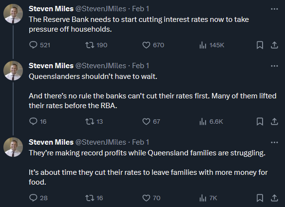 But facts rarely stop politicians from opening their mouths, so it was no surprise when some of them called for an immediate cut in Australia’s cash rate. The Premiers of three states, Queensland, Victoria, and Western Australia, all hit the media circuit late last week imploring the RBA to act now and cut rates. The most vocal of the three was Queensland’s new 46-year-old Premier Steven Miles, who made the below comments on social media.