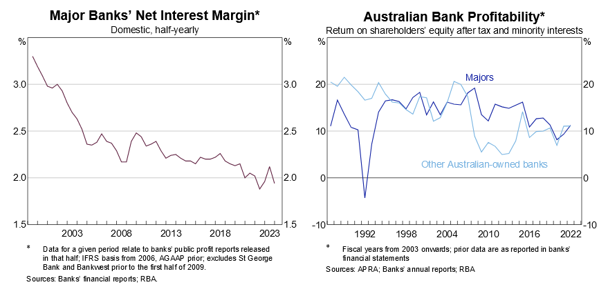 Second, while it’s true that banks can cut rates independently of the RBA by reducing their margins, their first responsibility is to their shareholders. The record profits notched up by the banks are in nominal dollars, i.e., not adjusted for inflation, and their margins are at historic lows. Australian banks just aren’t that profitable these days.