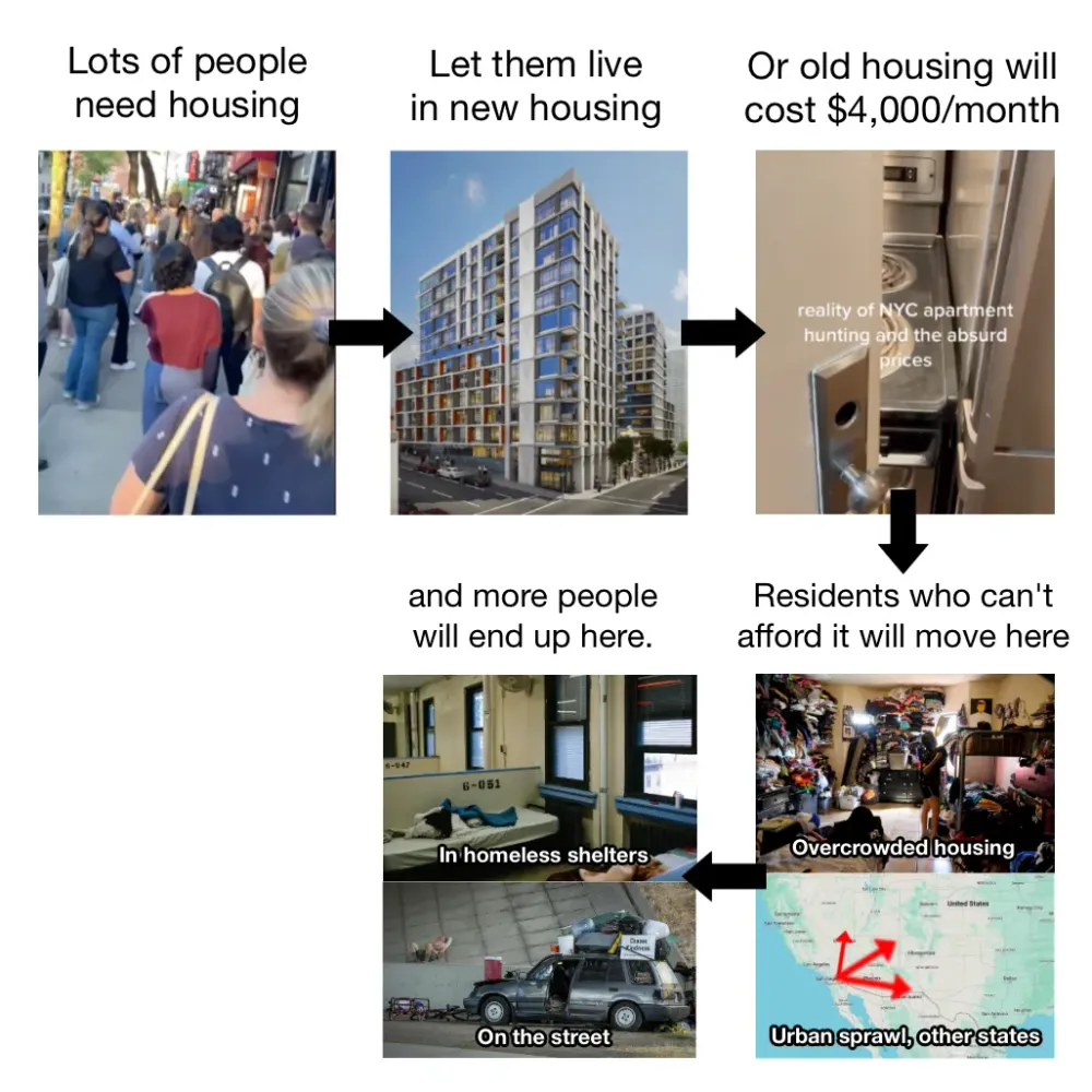 Do read the full essay and remember that even expensive new housing helps to reduce housing costs by creating a domino effect – for example, when people move into luxury apartments, they vacate housing for those with less wealth than themselves, who then free up housing for those with even less wealth, and so on.