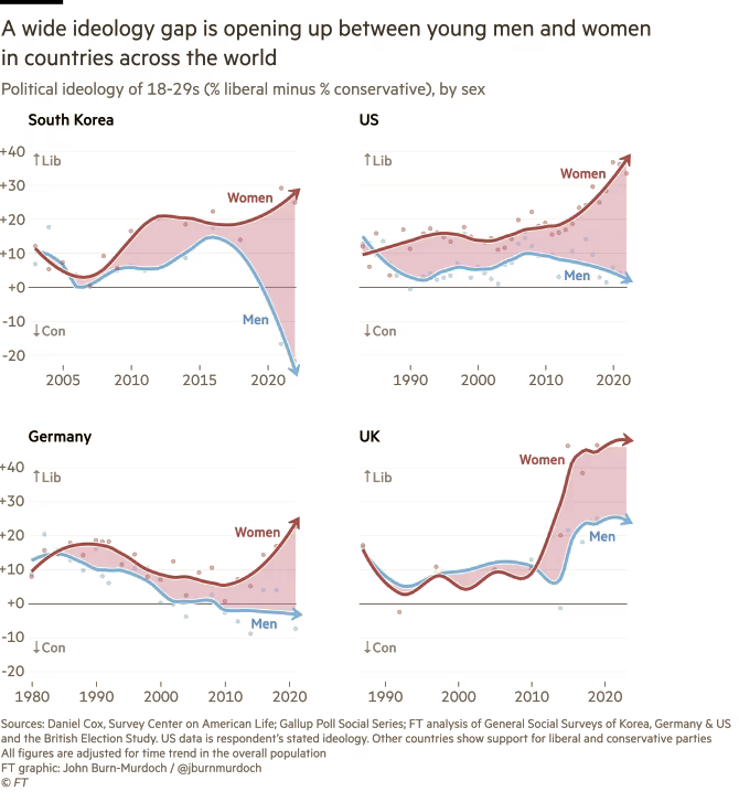 According to the FT, except for Germany and South Korea, “the trend in most countries has been one of women shifting left while men stand still”.