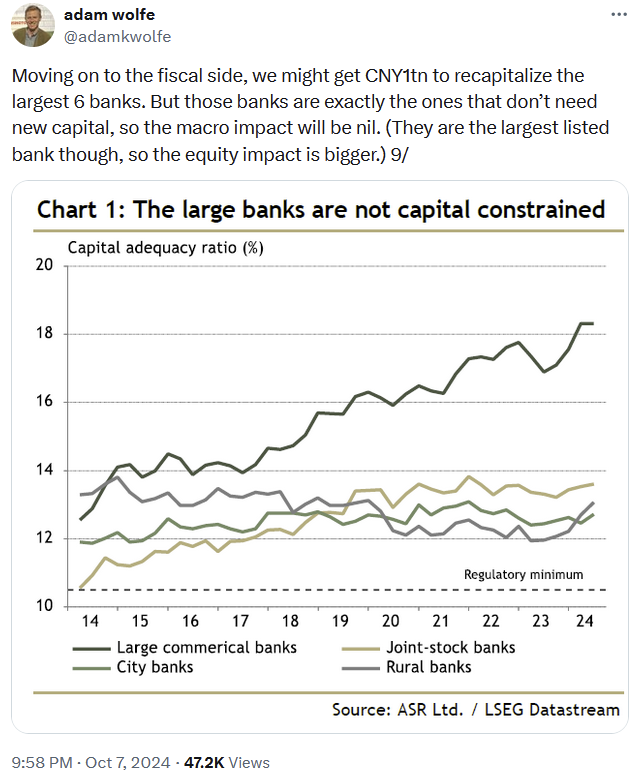 I think it’s a good thing that Xi hasn’t fired the bazooka. China definitely needed monetary easing, some of which will come automatically courtesy of the US interest rate cycle swinging into cuts. But large fiscal stimulus would be counter-productive in an economy that desperately needs resources to be reallocated away from the state, the big banks, and struggling sectors such as real estate, all of which would benefit from stimulus: