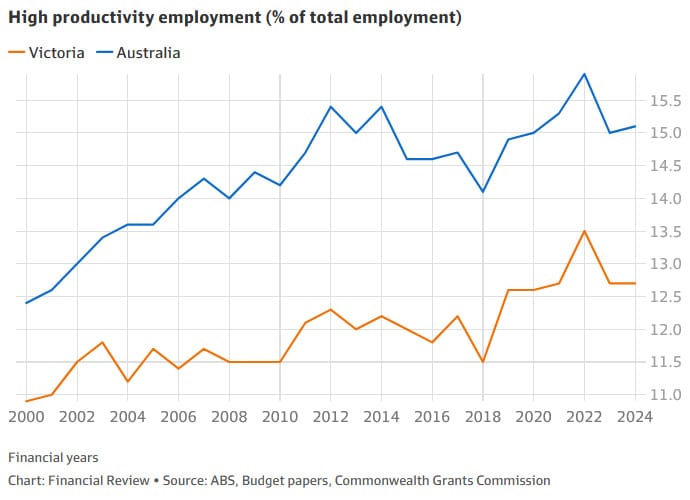 That’s from economist Saul Eslake, who noted that the decline isn’t because Victorians work less – more of them work than the national average, and while they work less that has been relatively steady over the decades (all those public holidays!) – but because of below-average productivity papered over with state government asset sales and “persistently larger cash deficits over the past decade than any other state or territory”.