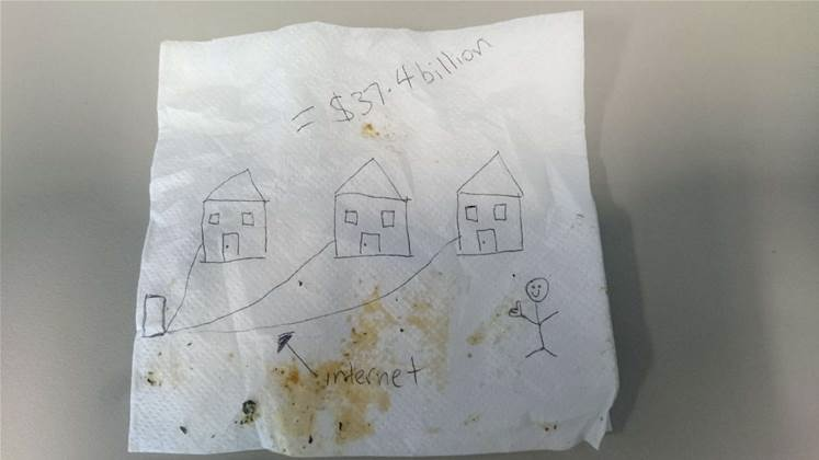 If you’re not familiar with the history of the NBN, folklore has that it was conceived by then-Communications Minister Stephen Conroy, who scribbled the idea on the back of a napkin when he and then-Prime Minister Kevin Rudd were travelling on a plane together. The plan was rumoured to look something like this: