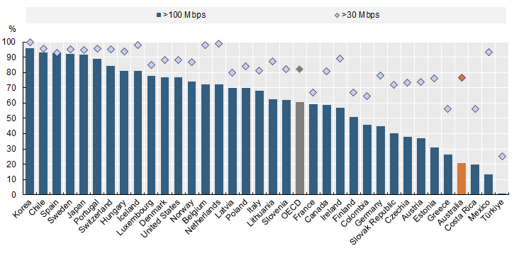 As at December 2022, our internet ranked as one of the slowest in the OECD in terms of the percentage of fixed broadband subscriptions with speeds faster than 100Mbps, which was achievable with the technology Optus and Telstra were already using prior to the NBN (Hybrid Fibre Coaxial, or HFC, more commonly known as cable).