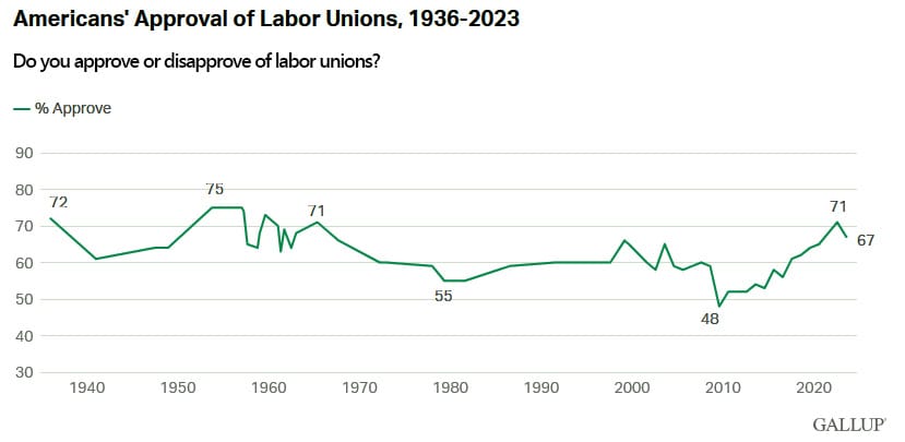 Unions sound like a good idea; who would object to groups of workers coming together to secure better pay and benefits? They’re popular with the public, with opinion polls frequently showing that people think favourably of unions, even if the majority is “not interested at all” in actually being a member of one.