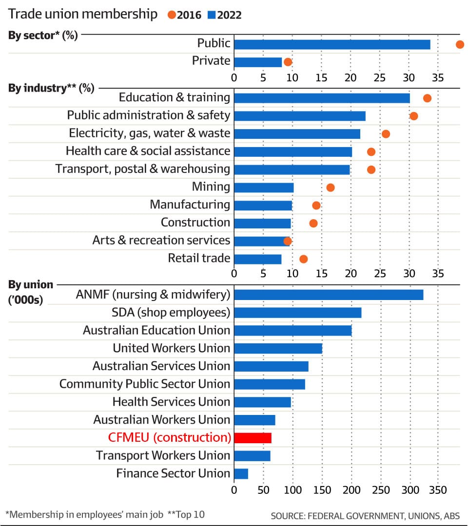 So, this doesn’t look like it’ll just blow over any time soon. It might get swept under the rug for a while – perhaps until the next federal election – but the ‘militant’ arm of the CFMEU still has considerable support. And as an economist, of course the whole saga got me thinking about the role of unions in Australia.