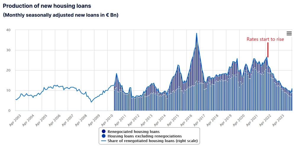 There are downsides to such a relatively risk-averse model. For example, when rates rise, loans issued tend to fall not because consumers don’t want to borrow but because the banks can’t make money on new mortgages: fixed-rate mortgages are tied to the market in government debt, and there are usury rates (maximum interest rates) set by the Bank of France that tend to trail market rates.