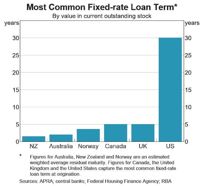 What the chart doesn’t show are terms. For example, the UK has a relatively large share of fixed mortgages but they’re mostly for fewer than 5 years, so in practice they’re not all that dissimilar to Australia.