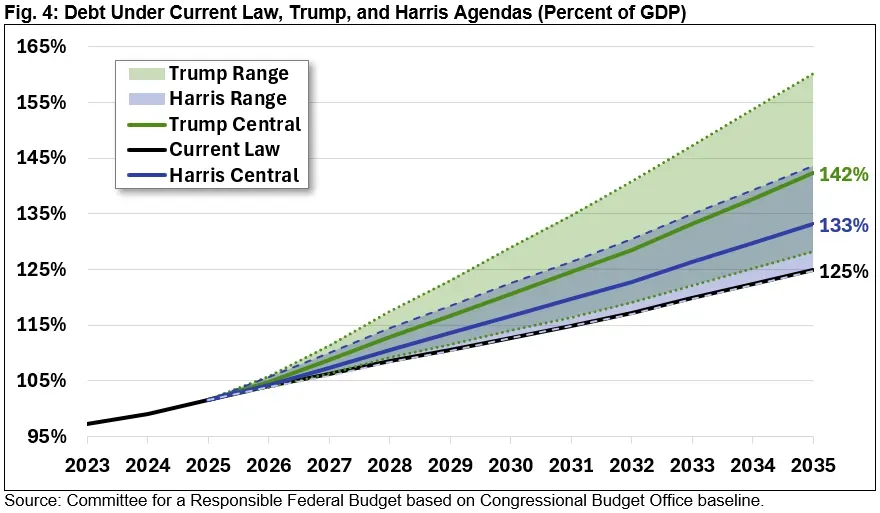 As for Donald Trump, many of the economically positive things he wants to do – e.g. cutting the corporate tax rate to 15% and extending the 2017 temporary tax provisions – will face similar Congressional roadblocks. And they might even be harmful when considered as a whole, rather than in isolation: if his tax cuts were passed after even one of his other distortionary tariff or tax changes, they could end up decimating an already-precarious budget, bringing forward legitimate questions about fiscal solvency and the dreaded “reckoning”.