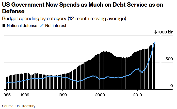 It’s all well and good to have such ambitious spending proposals, but neither candidate has any real plan of how to pay for them, other than with more debt. And that approach is clearly unsustainable, with interest payments alone fast approaching 30% of all government revenue. Interest payments also recently surpassed defence spending for the first time, violating historian Niall Ferguson’s “vulnerable empire” threshold: