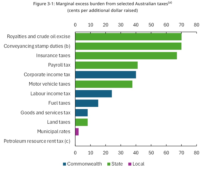 Royalties and stamp duties are near the top because they effectively tax you regardless of whether you’re making money, which prevents beneficial exchange—whether by raising the hurdle rate for a worthwhile new mine, or making it costly to relocate for work. They persist because, constitutionally, Australian states have few alternative avenues from which to raise revenue.