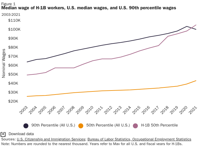Bernie is, of course, wrong on all counts. H-1B visa recipients are required to be paid at least the prevailing wage for their job and location, and the data show that they tend to earn more than local workers.