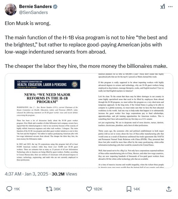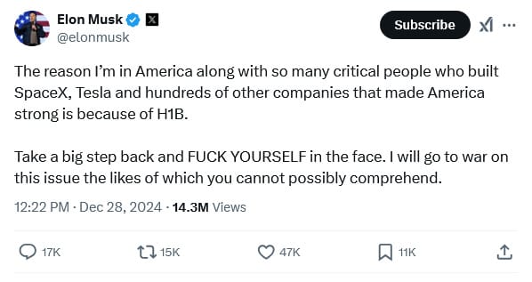 And I mean war. For example, here’s a response by Elon Musk to someone telling him it was foolish to “optimise H1B” because it “shouldn’t exist” at all: