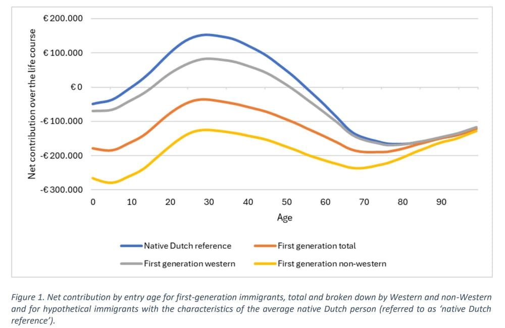 “Focus on the blue line for natives. People are net negative while they are young before they work, and net negative after they stop working. Children cost some money and produce nothing, retirees cost a lot of money (in pensions and healthcare) and produce little. Working age people produce a lot and cost little. The entire point of having useful immigrants is having people whose net contribution curve is pushed upwards such that the lifetime value is as positive as possible. As can be seen here, no matter at which age and where immigrants come from outside of the west, broadly speaking, they are net negative across the line span, as the Dutch natives are approximately net neutral. (I note that their models must be somewhat off because age 10 is when natives become net positive, but that’s impossible, it cannot be earlier than 20, and more realistically 25-30.)”