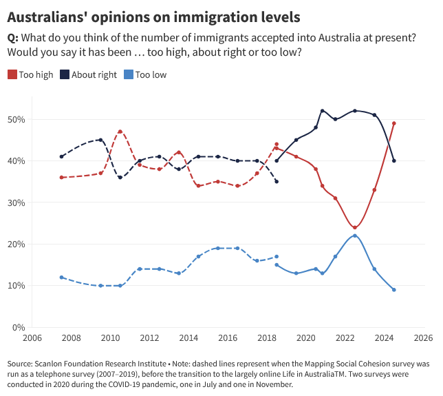 Australia has a long and successful history with immigration. But over the past two years, the post-pandemic surge in migration has awoken people’s inner xenophobia in ways that I think might be harmful for Australia’s longer-term prospects. For example, a survey taken late in 2024 found that close to a majority of people now thought Australia was now taking in too many migrants: