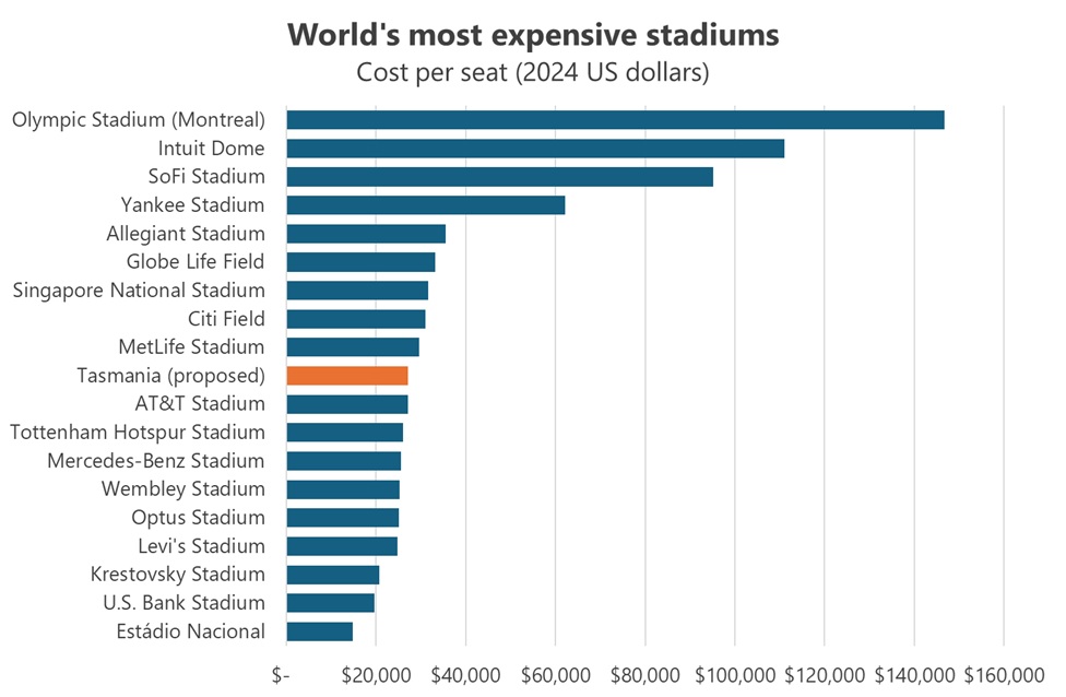 Ah yes, the new billion-dollar AFL stadium, designed with a capacity of 23,000, or nearly 10% of Greater Hobart’s population. Excessive? Just a tad. In fact, at roughly $41,000 per seat it would be one of the most expensive stadiums in the world—assuming no further cost blowouts (hah!):