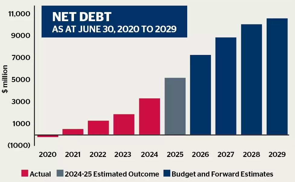 The Rockliff government will allow net debt – negligible when the Liberals came to power in 2014 – to further balloon, from $5.26bn this financial year to $10.78bn in 2028-29.