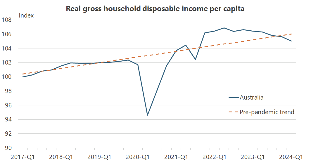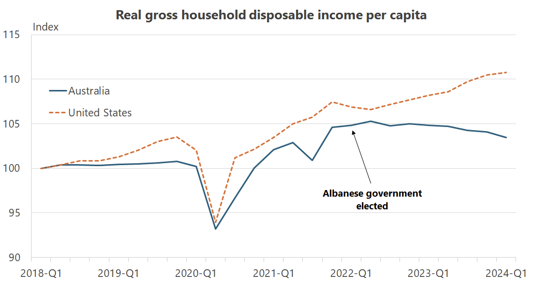 Put it all together, and during a period of global inflation it was inevitable that US households would look significantly better than Australia in the aggregate – i.e. as measured by real gross household disposable income per capita – regardless of who happened to be occupying Parliament House.