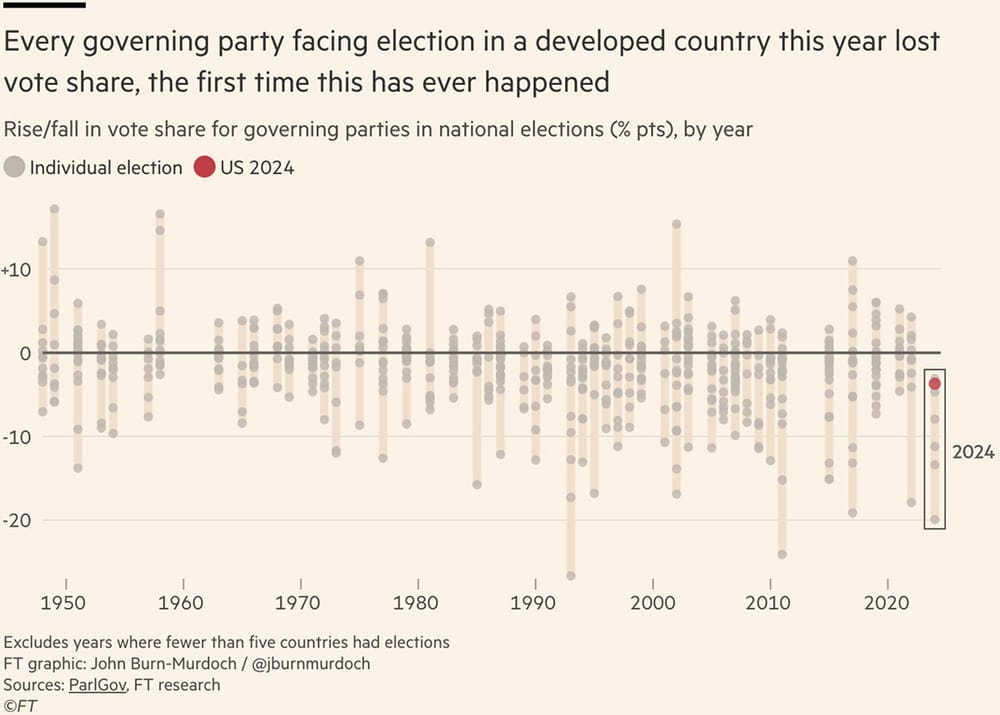 But despite all those caveats, there’s a good chance that the Albanese government is going to be punished at the ballot box. Just like virtually every other inflation-incumbent government this year: