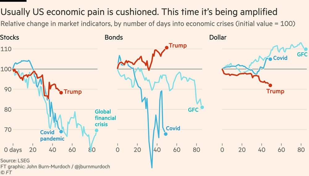 Basically what normally happens is investors think ‘Stocks are too risky now, so let’s shift into US bonds and the dollar, which are a safer bet because America is a stable and well-run country with a good handle on its deficit and inflation.’ This time? Not so much.”