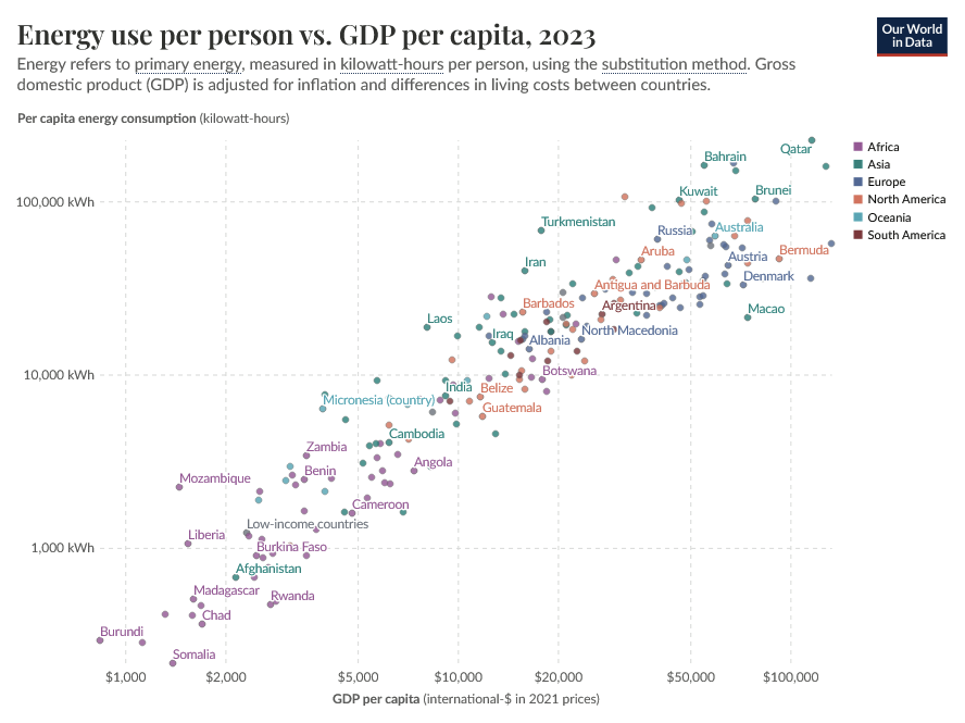 Energy use correlates exceptionally well with economic growth, enabling wealthier households to afford lighting, appliances, air conditioning, and even electric vehicles: