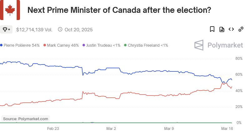 Carney also knew that repealing Canada’s carbon tax would boost his poll numbers, given that opposition leader Pierre Poilievre had been calling him “carbon tax Carney” for the past few months. Prediction markets now have the election as a virtual coin toss: