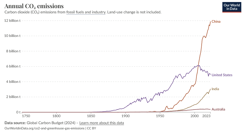 The climate doesn’t care about per capita emissions, so when the world’s largest polluters are also the biggest free riders – and one of them is even a geopolitical rival – it doesn’t make much sense to sacrifice growth for little benefit. Basically, China and India’s emissions will completely swamp anything Australia does.