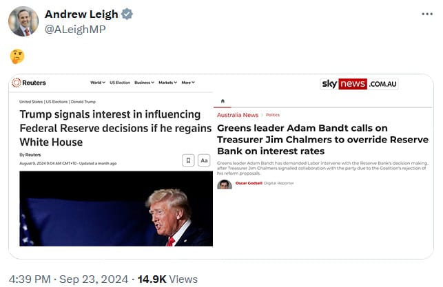 The constraint ensuring an independent monetary policy is informal – there are no restrictions on the Treasurer taking control – because everyone knows that the alternative is much worse. The good news is that on this issue, Labor doesn’t appear willing to compromise. At least if this tweet from Minister Leigh comparing the Greens’ demand to Trump is anything to go by: